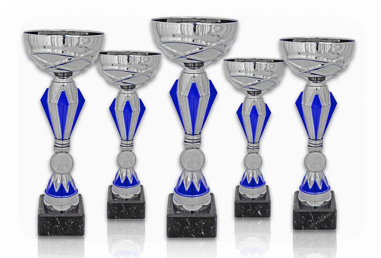 Pokaler i silver och blått med plats för motiv. Finns i 5 storlekar mellan 22,5 & 30 cm.