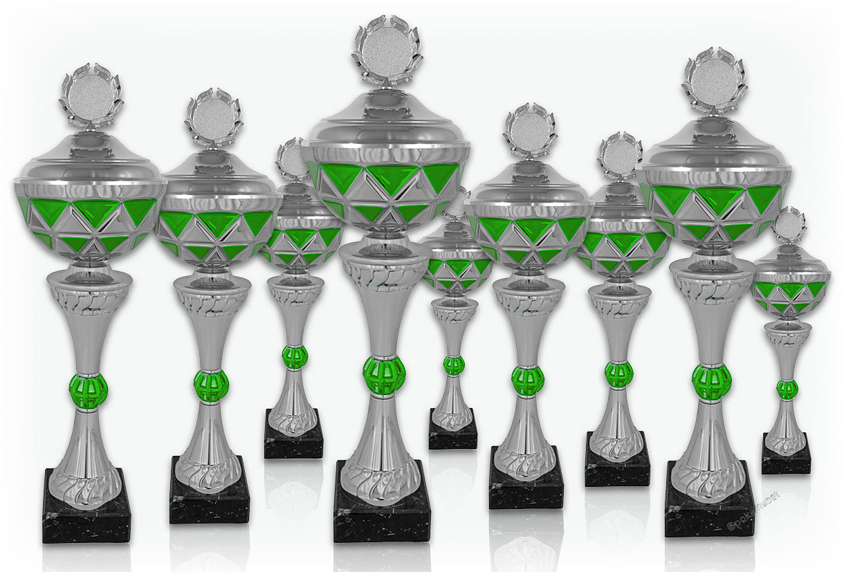 Silverpokaler med gröna inslag.