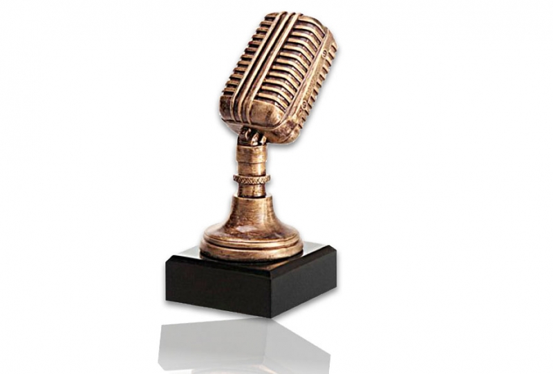 Mikrofon i "antik guld" på svart träsockel