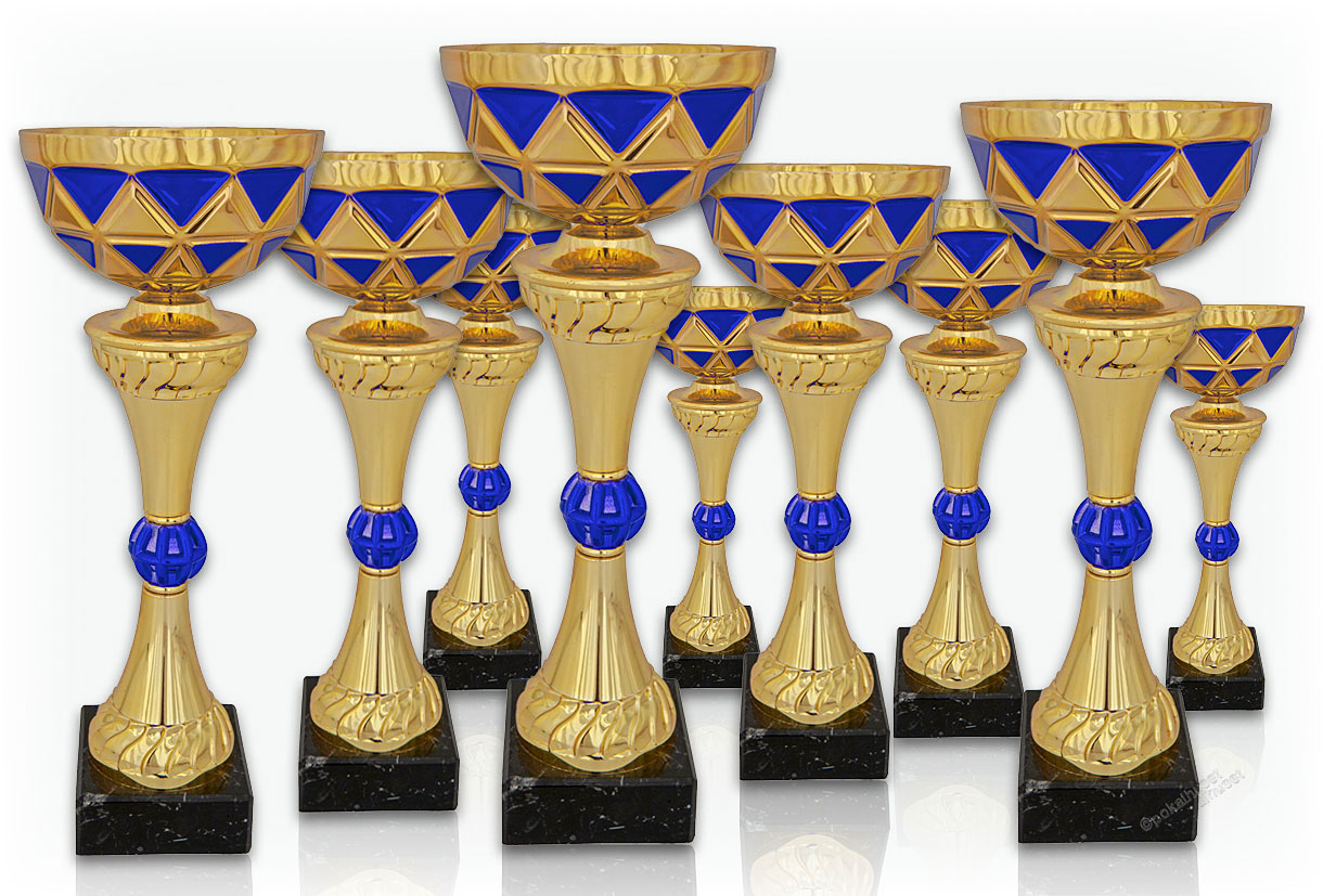 Pokaler i guld med blåa inslag.