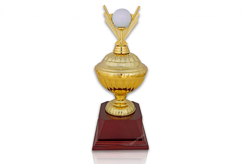 Fin golfpokal på träsockel med plats för egen golfboll.