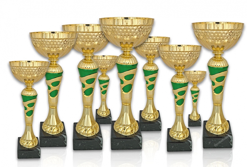 Pokaler i guld med gröna inslag.