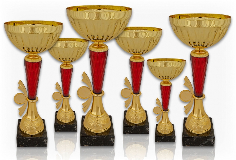 Pokal i guld och rött på svart marmorsockel.