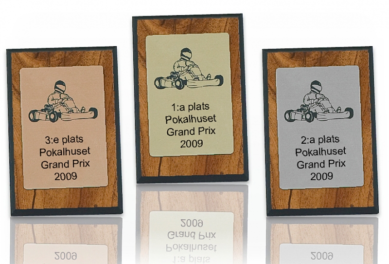 Träplakett med gravyr på metallfolie.